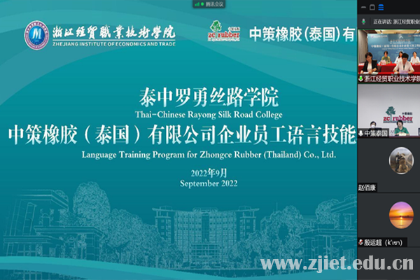 9月21日,学校与中策橡胶(泰国)有限公司联合举办的语言技能培训项目,以线上视频会议的方式顺利开班。学校副校长蒋丽君,中策橡胶(泰国)有限公司总经理陈华、副总经理高科、总经理助理戴燕萍出席开班仪式。学校公共教育学院和国际交流与合作中心相关教师以及中策泰国全体培训学员参加活动。